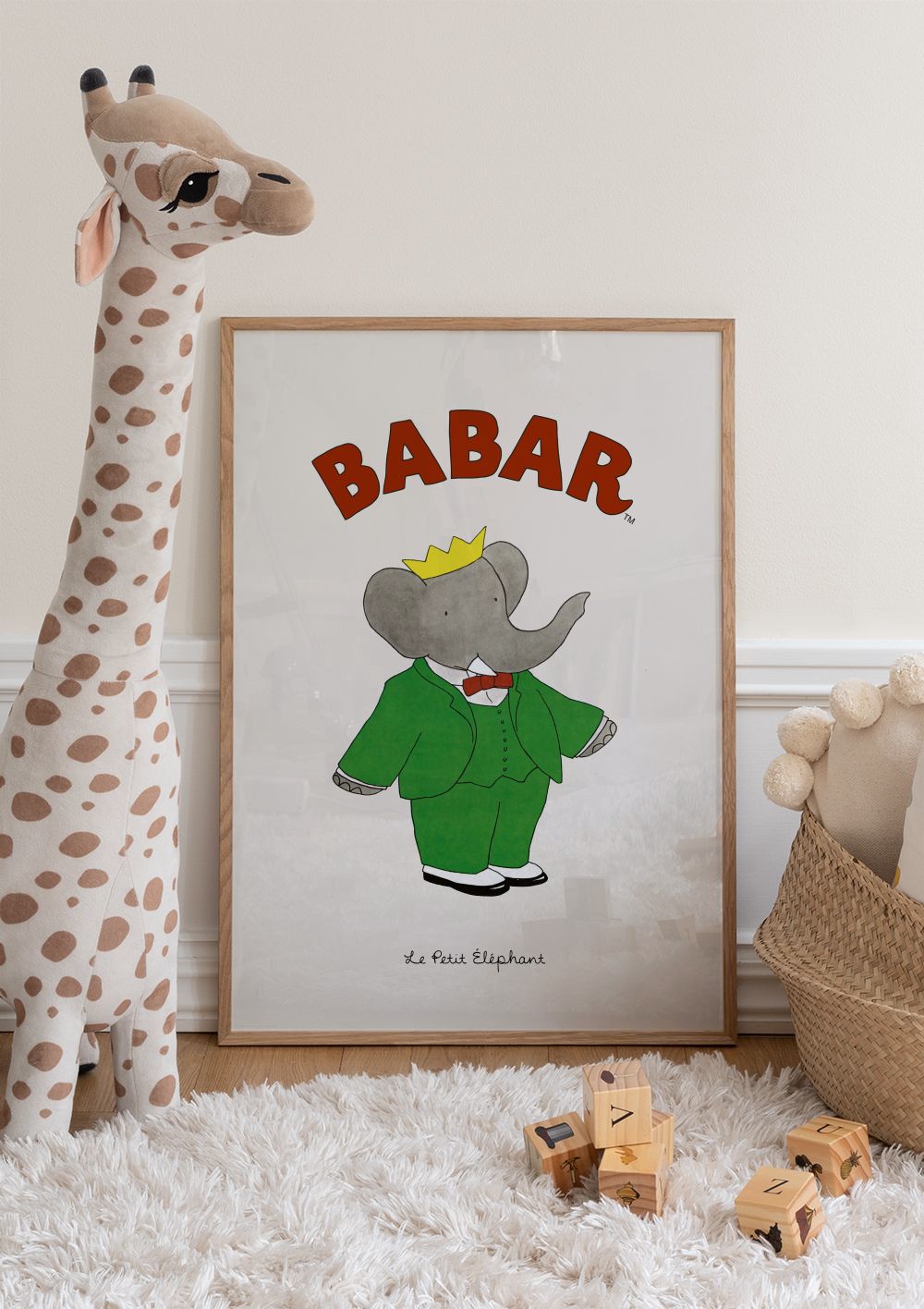 Ein Poster von Babar dem Elefanten mit einer gelben Krone, einem grünen Anzug und einer roten Fliege. Das Wort "BABAR" steht in großen roten Buchstaben über dem Elefanten.