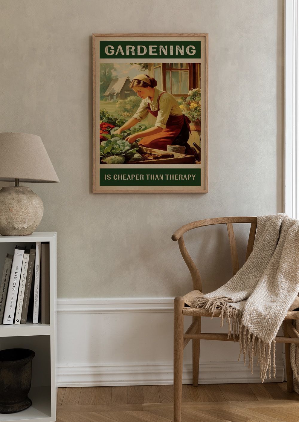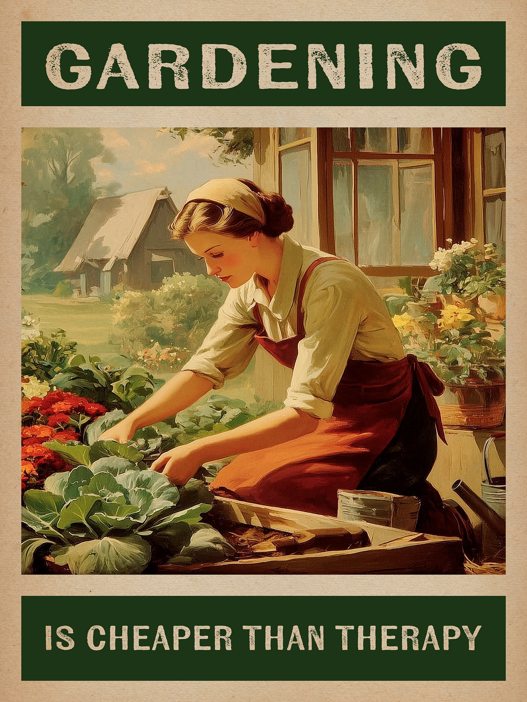 Ab 9,07 €Ein farbenfrohes Poster einer Frau beim Gärtnern mit grünen Pflanzen. Das Bild zeigt eine fröhliche Szene in Grün-, Rot- und Brauntönen mit dem Text "GARDENING IS CHEAPER THAN THERAPY".
