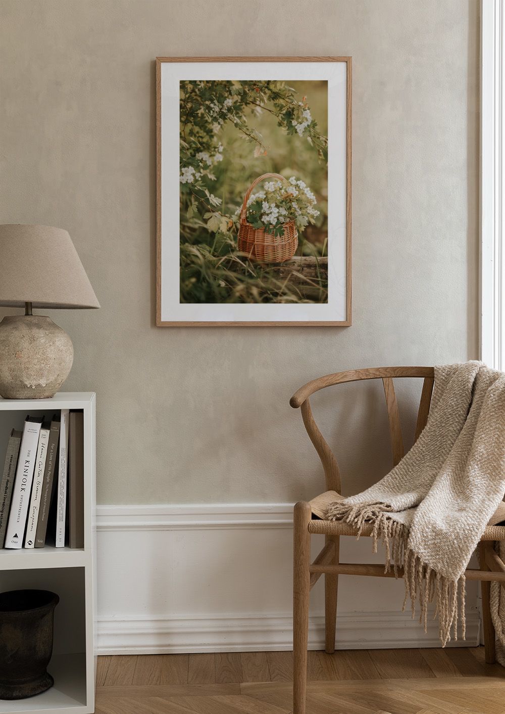 Ein Weidenkorb voller weißer Blüten und grüner Blätter. Das Poster zeigt eine ruhige Naturszene mit sanftem Licht und ist perfekt für dein Zuhause.