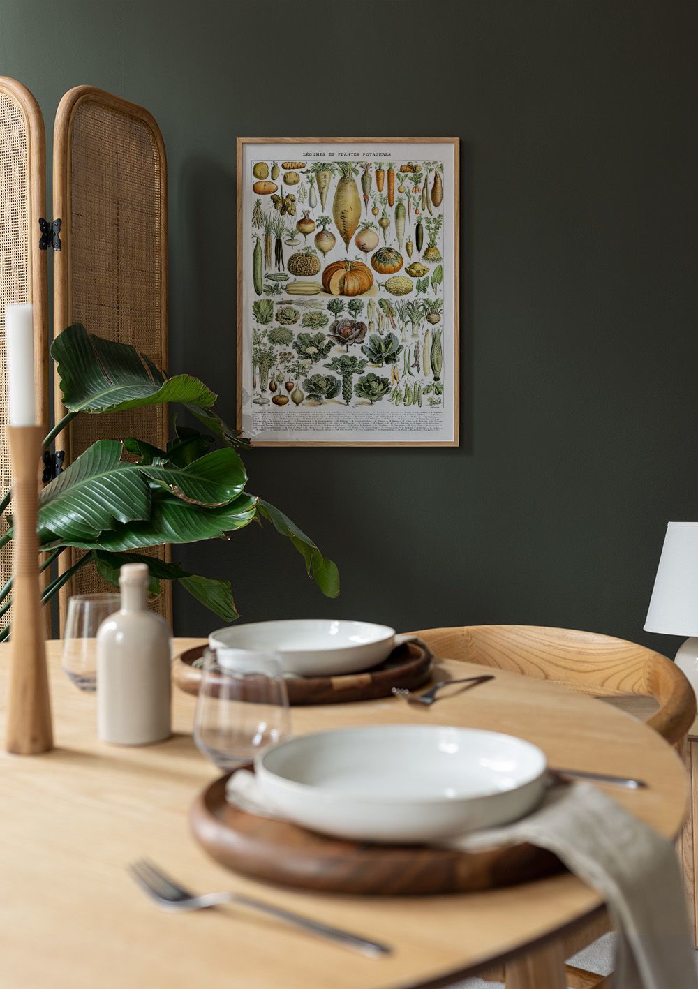 Ein Vintage-Poster mit verschiedenen Gemüsesorten wie Karotten, Kürbissen, Radieschen und Kohl. Die bunten Farben in Grün, Orange und Braun bringen Leben in deine Küche.