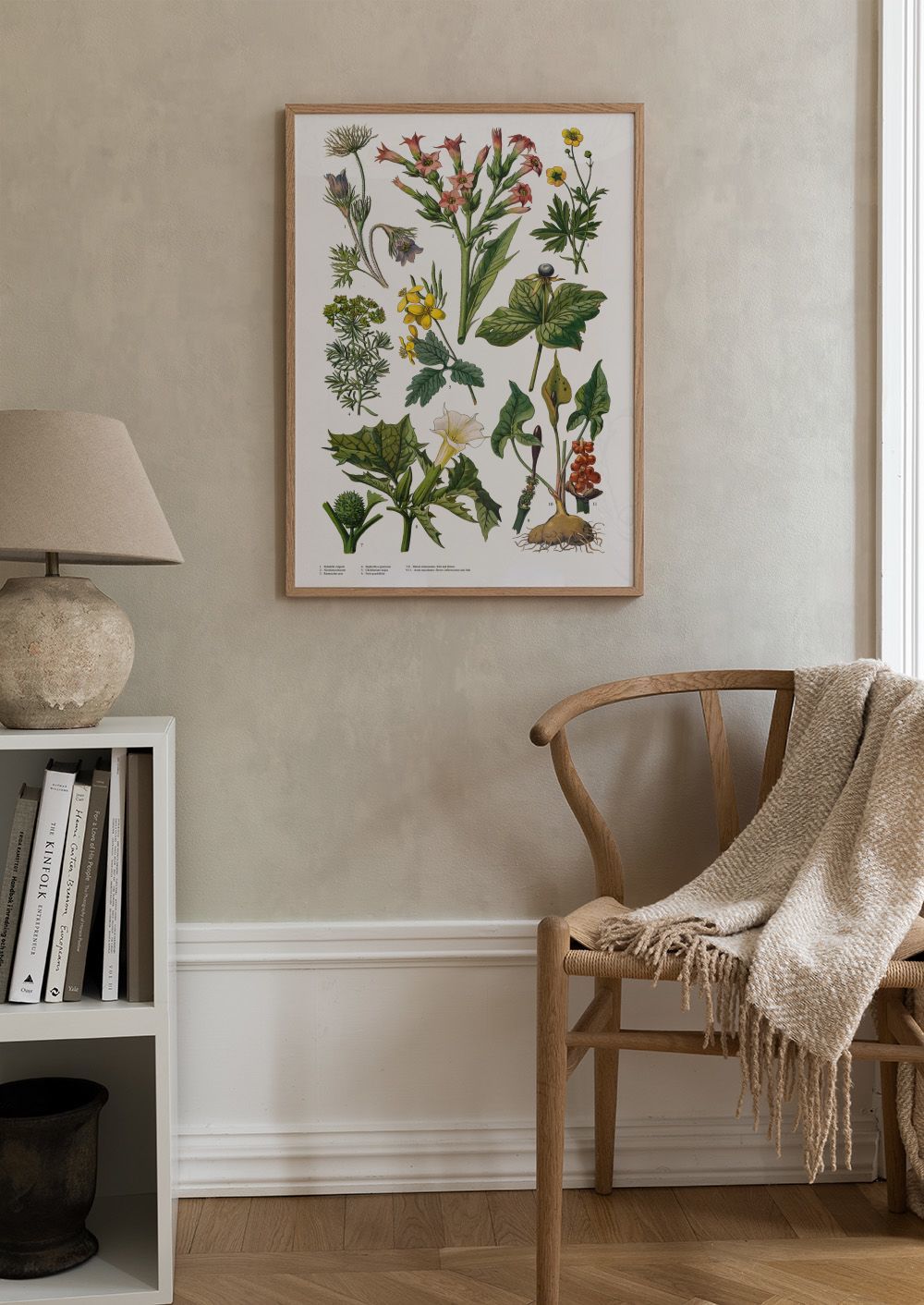 Ab 9,07 €Ein wunderschönes Vintage-Poster mit verschiedenen Pflanzen in leuchtenden Farben. Die Illustration zeigt grüne Blätter und bunte Blüten in Pink, Gelb und Weiß auf weißem Hintergrund.