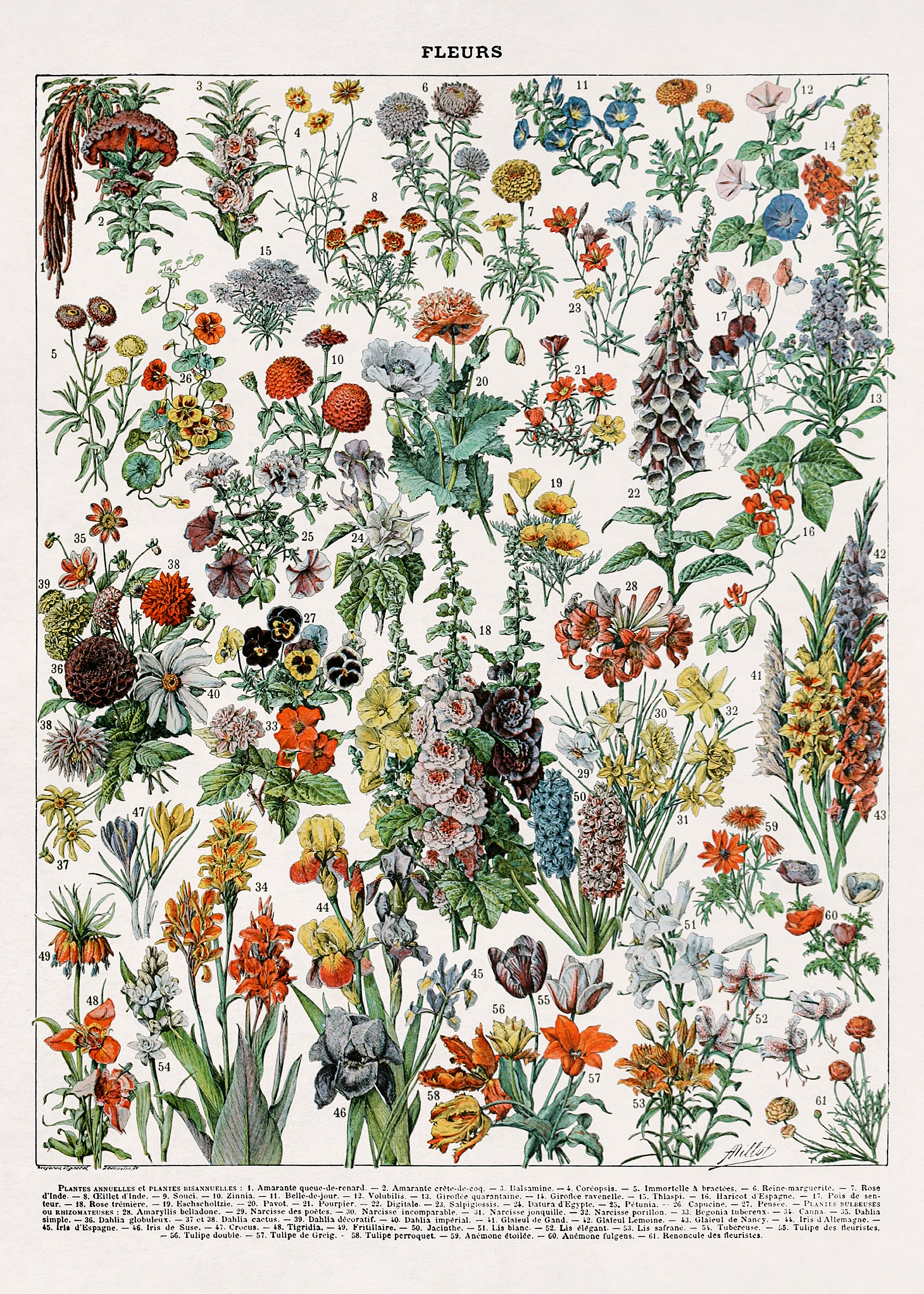 Ein buntes Poster mit vielen verschiedenen Blumen in Rot, Gelb, Orange, Blau, Lila und Weiß. Die Illustration erinnert an alte botanische Zeichnungen.