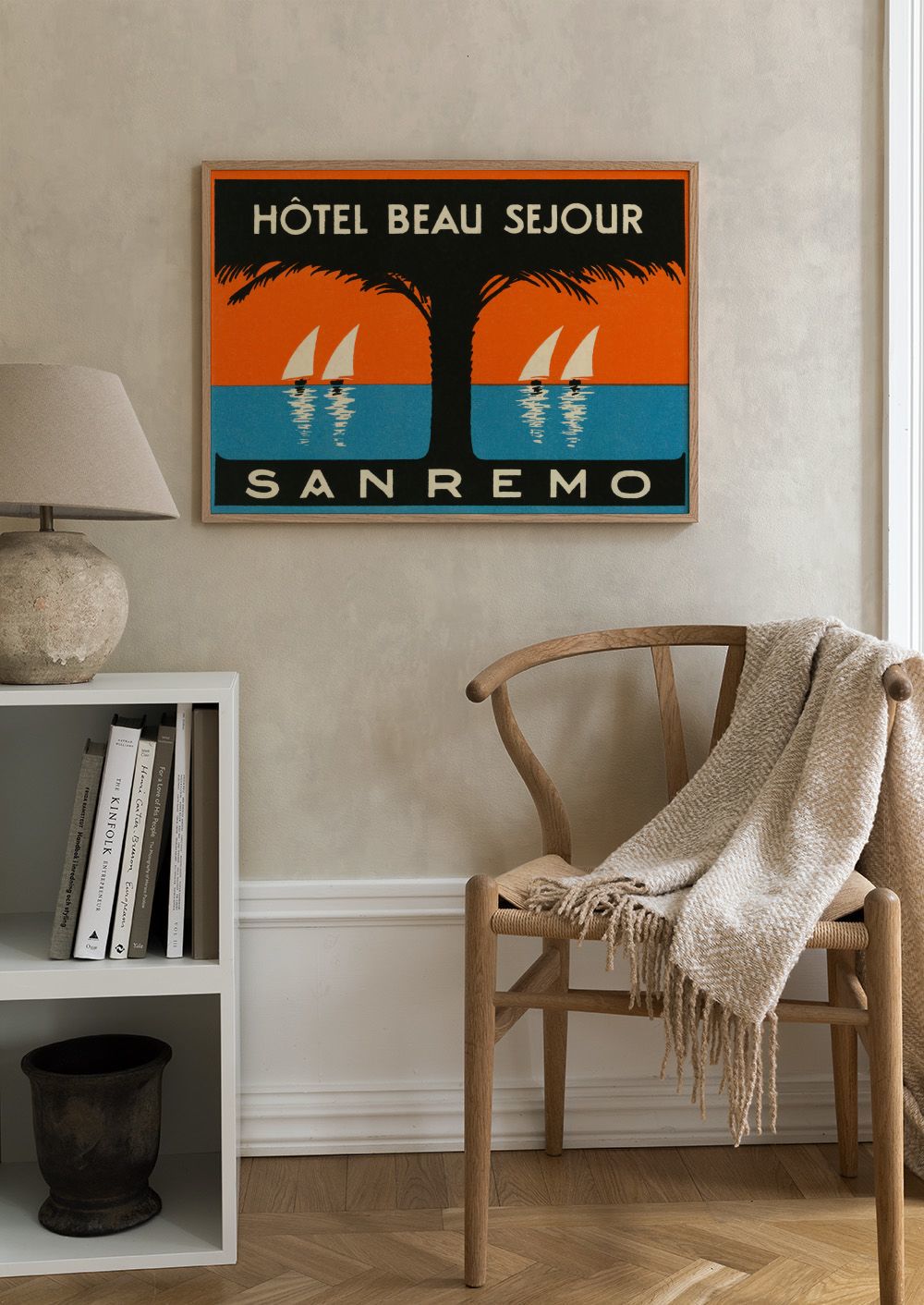 Une affiche vintage avec un palmier noir et des voiliers blancs sur une mer bleue sous un ciel orange.