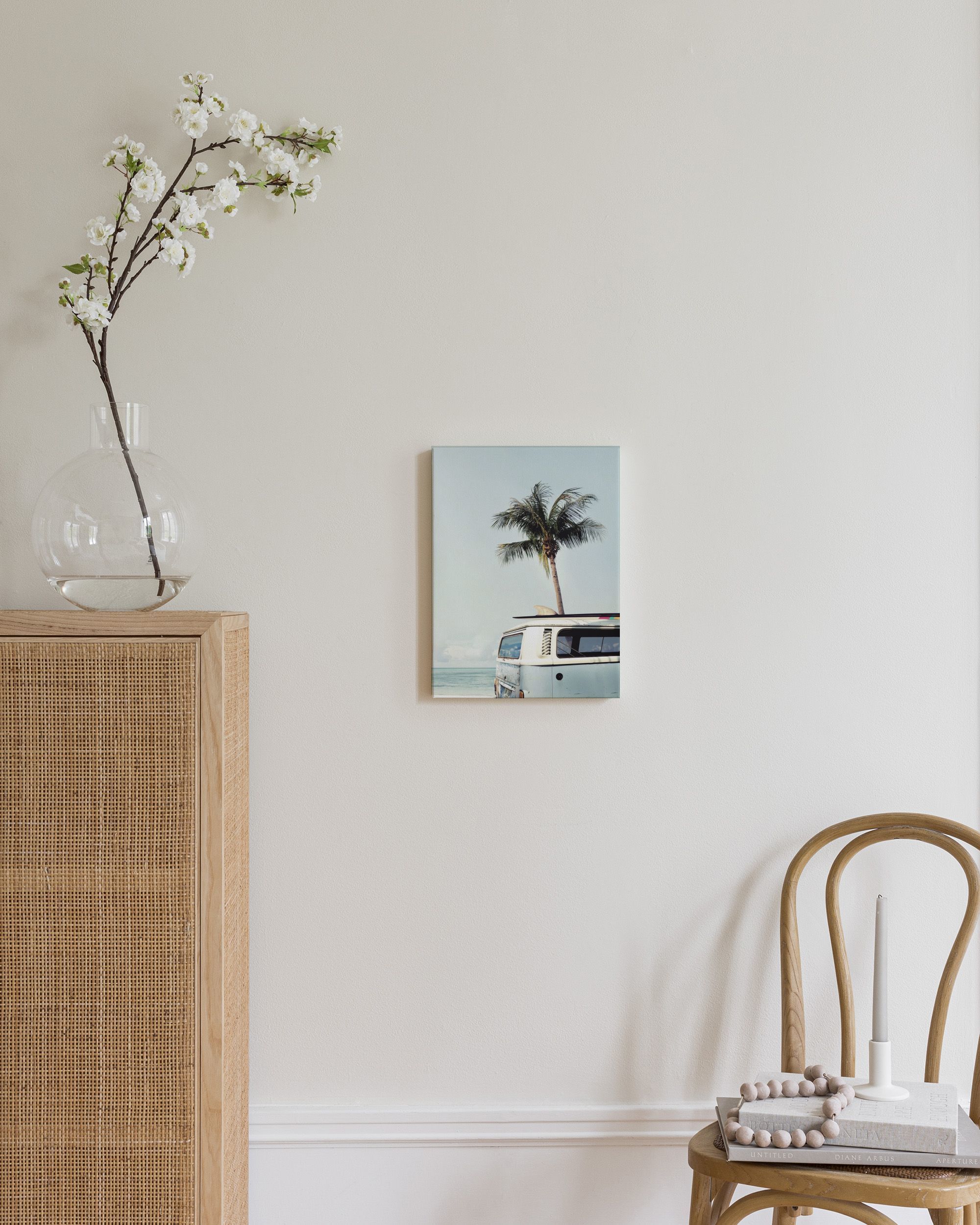 Transportez-vous vers des vacances ensoleillées avec cette affiche vintage d'un van bleu au bord de la plage, parfaite pour créer une ambiance détendue.