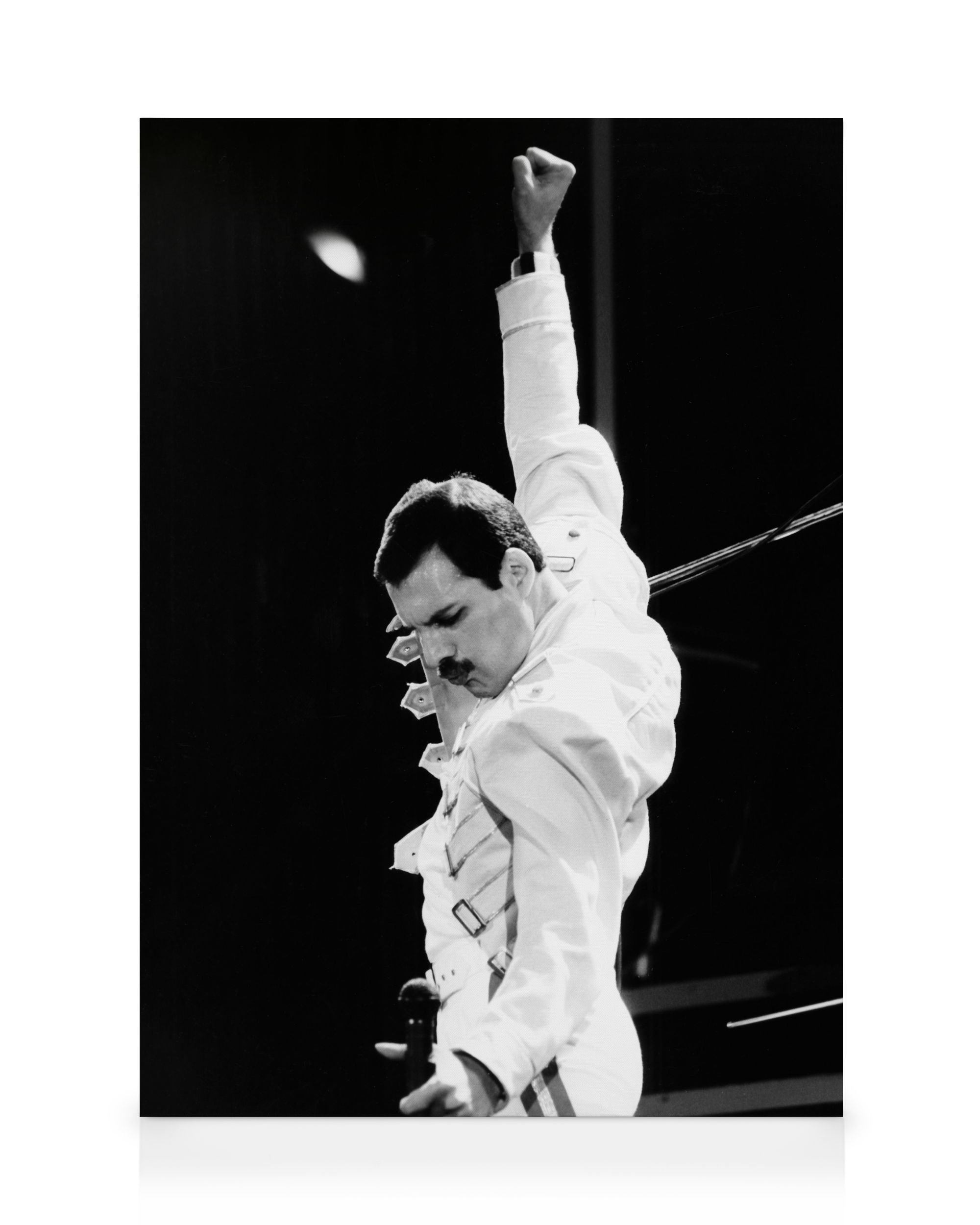 Vanaf € 6,45Een zwart-wit canvas van Freddie Mercury die optreedt op het podium met een microfoon, arm hoog geheven. Perfecte wanddecoratie voor muziekliefhebbers.