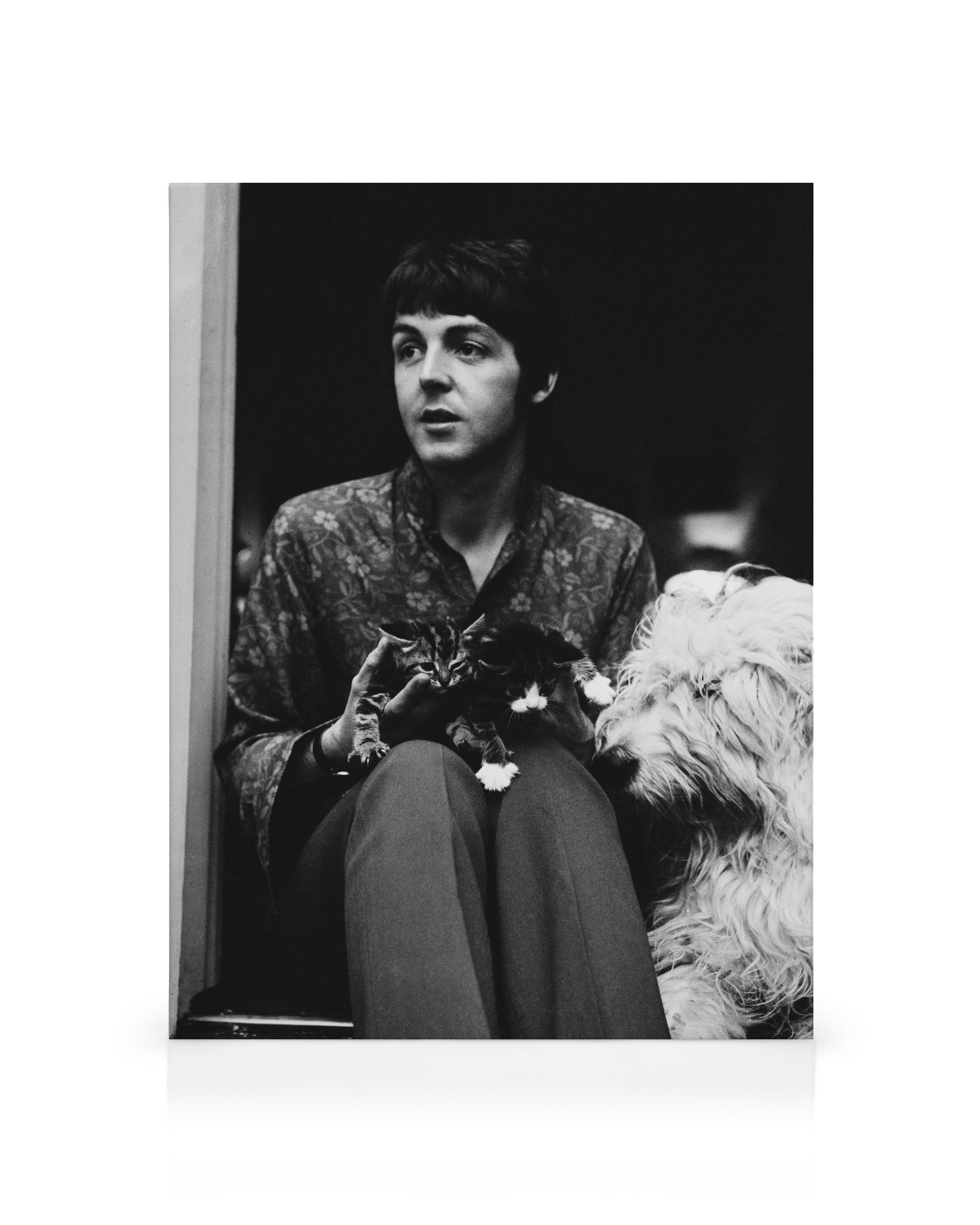Een zwart-wit canvas van Paul McCartney die twee kittens op zijn schoot houdt, met een pluizige hond naast hem die naar de kittens kijkt.