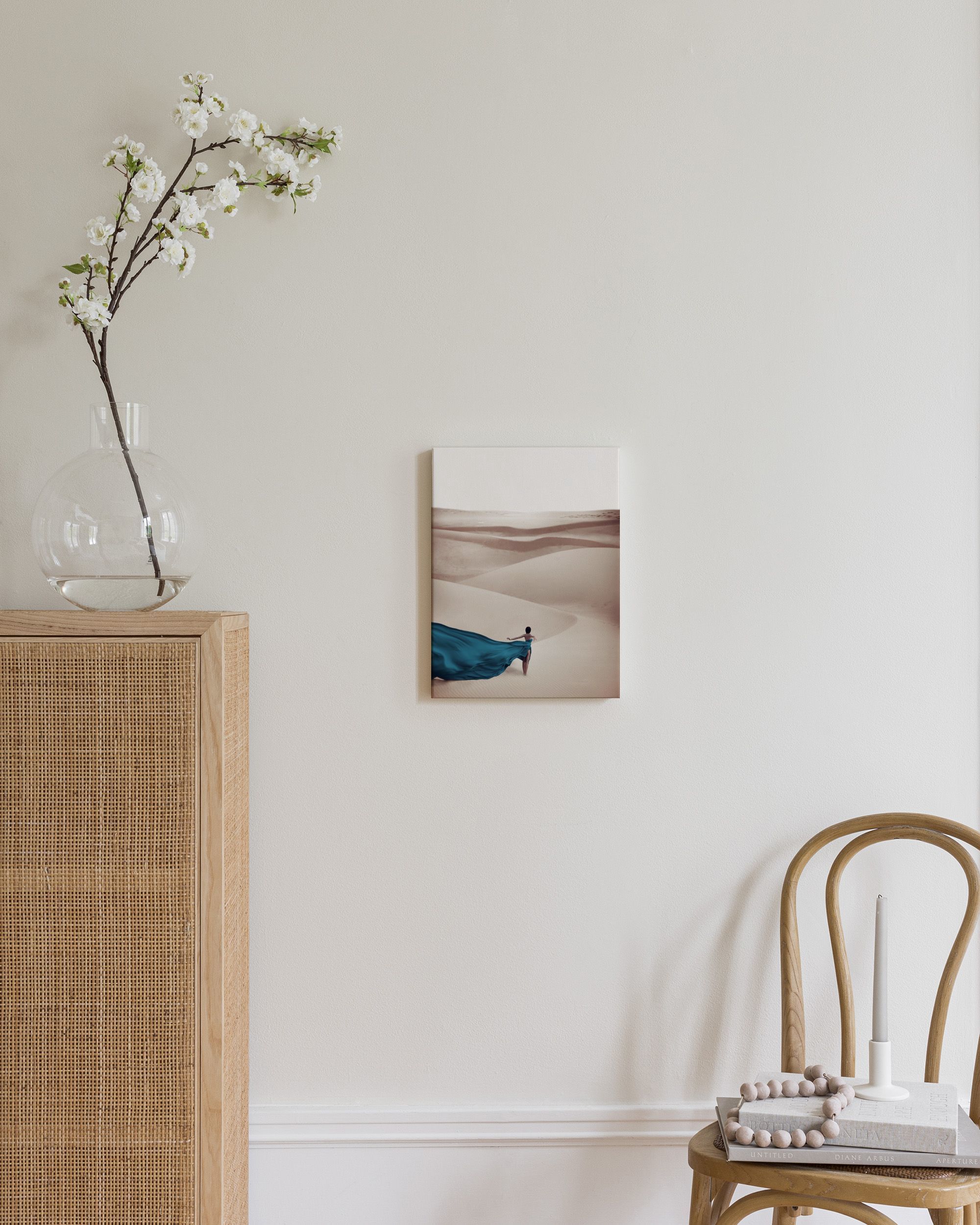 Een persoon staat in de woestijn met zandduinen. Ze draagt een lange, blauwe jurk die achter haar waait. De lucht is licht en het zand is beige gekleurd.