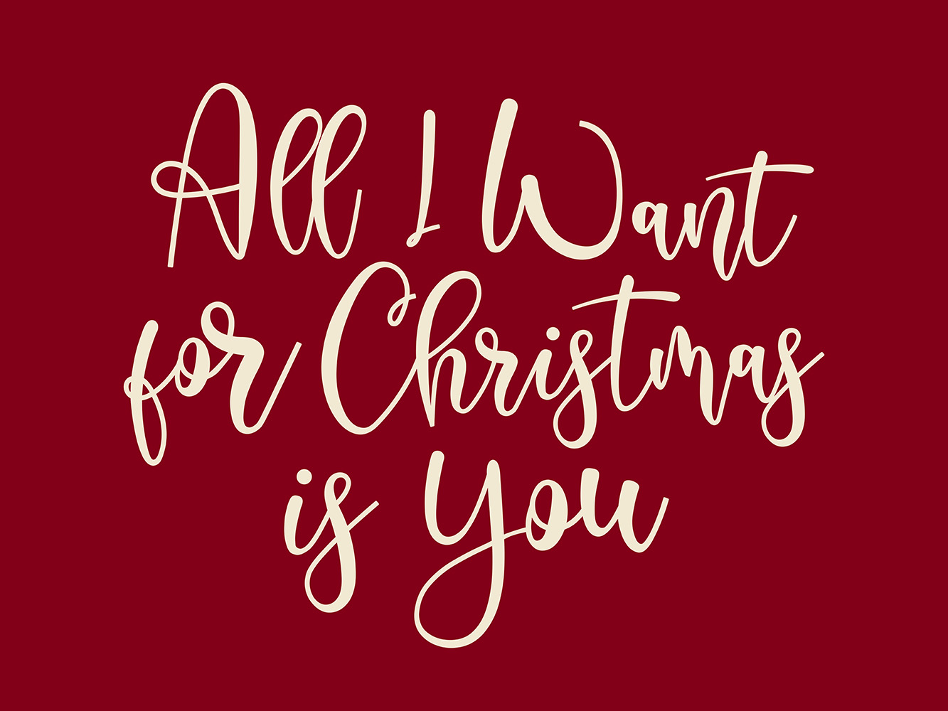 Een feestelijke poster met de tekst "All I Want for Christmas Is You" in elegante letters. De donkerrode achtergrond en crème tekst geven je huis een warme kerstsfeer.
