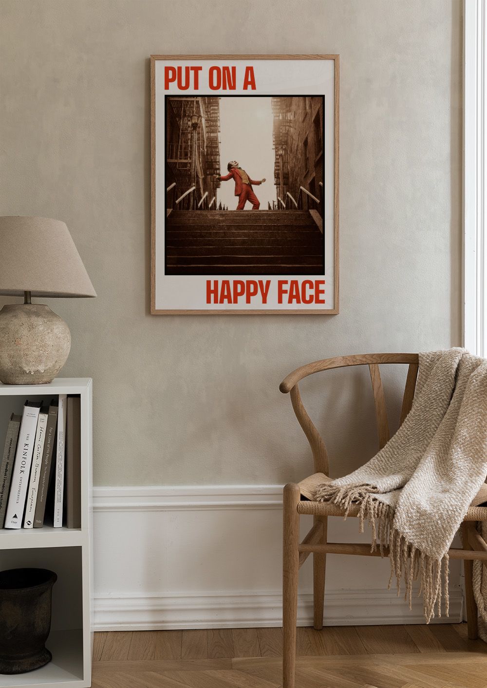 Een poster met een persoon in een rood pak op een grijze trap. De poster heeft de tekst "PUT ON A HAPPY FACE" in grote rode letters. Perfect voor een stoere look aan je muur.